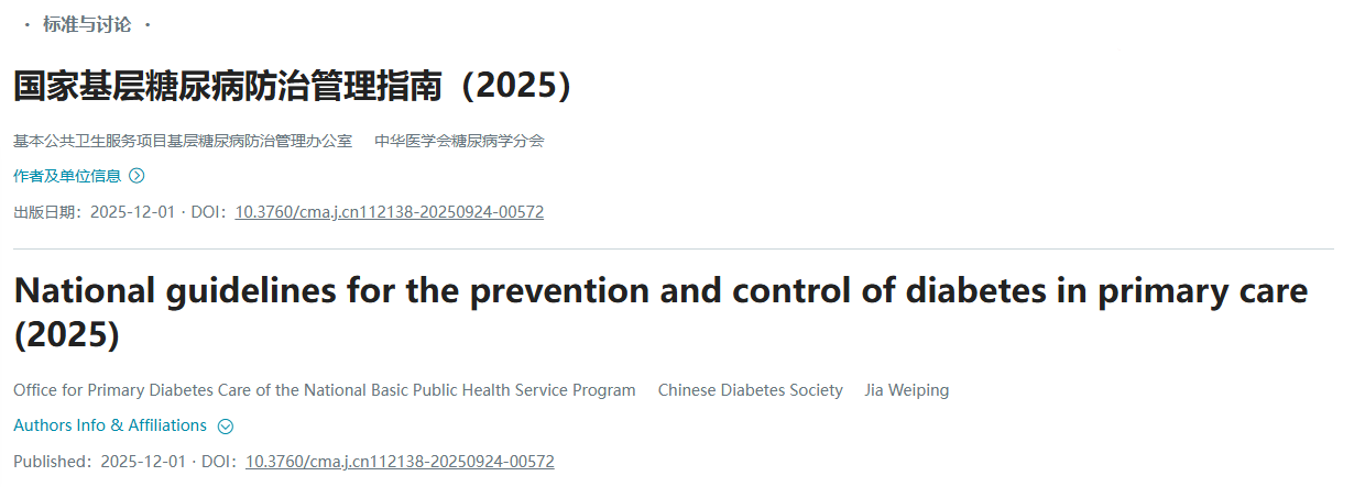 [3] 基本公共卫生服务项目基层糖尿病防治管理办公室, 中华医学会糖尿病学分会. 国家基层糖尿病防治管理指南(2025)[J]. 中华内科杂志, 2025, 64(12): 1169-1186. DOI: 10.3760/cma.j.cn112138-20250924-00572.