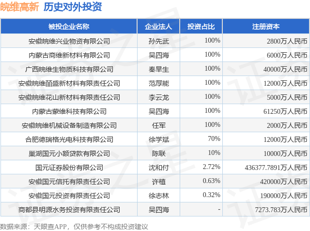 本站消息,根据天眼查APP显示,皖维高新(600063.SH)新增一起对外投资事件,被投资公司为安徽皖维兴业物资有限公司,法定代表人孙先武,投资占比为100%。该公司从事煤炭开采和洗选业,注册资本为2800万人民币。目前,皖维高新共存在对外投资13项正规炒股配资知识网,详见下表: